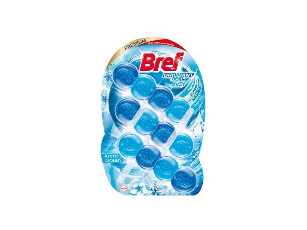 WC-blokk Bref Brilliant Gel Allin1 3x42g Jeges-tenger. A bref márka innovációja. Akár 20%-kal több öblítés a Bref Power Aktivhoz képest.