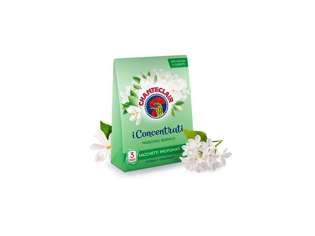 A CHANTE CLAIR I CONCENTRATI MUSCHIO BIANCO 3 db illatosító tasak illatosít bármilyen ruhásszekrényt, gardróbot, autót, utazó bőröndöt vagy akár a belső teret is. Intenzív és hosszan tartó, gyönyörű illat. Egy tipikus olasz termék, amely egyszerűen gyönyörű illatú. A Muschio Bianco a fehér pézsma jellegzetes illatával veszi körül.