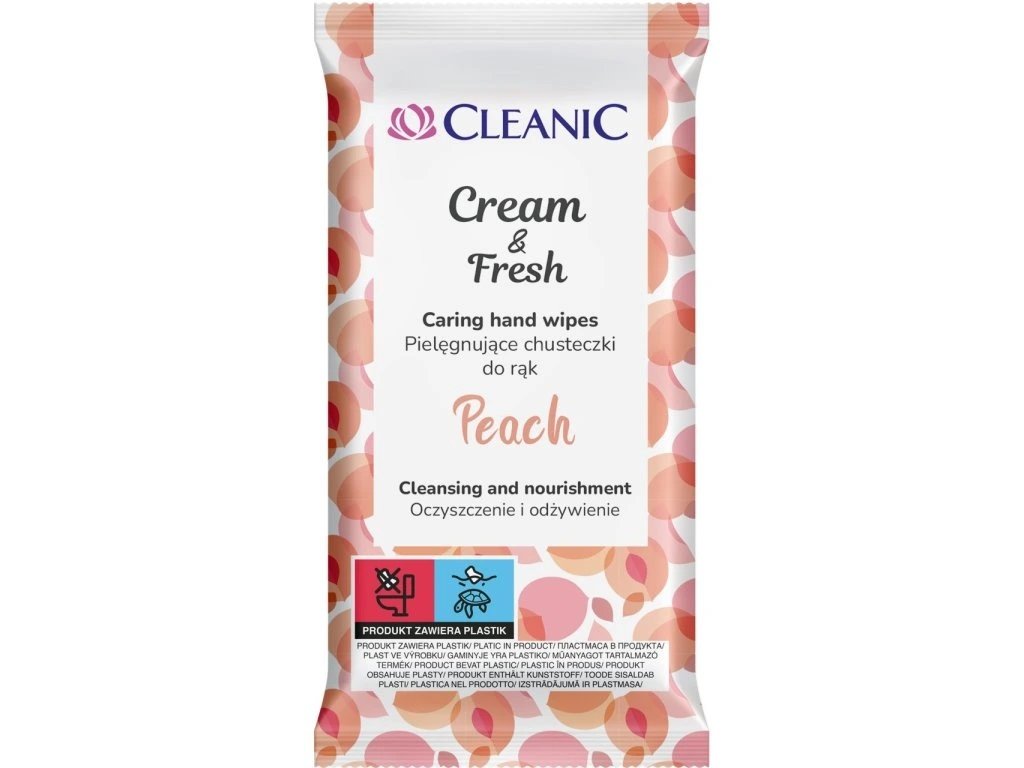 A Cleanic Cream & Fresh Peach nedves törlőkendők ötvözik a hagyományos törlőkendők felfrissülését és a kézkrém táplálását. Ideális kiegészítői a mindennapi bőrápolásnak, különösen az érzékeny és irritált bőr számára. Hatékonyan felfrissítik, tisztítják és táplálják a kezeket, miközben finom őszibarack illatot hagynak maguk után. Praktikus és könnyen használható - tökéletes utazáshoz, munkába vagy sétákhoz.
