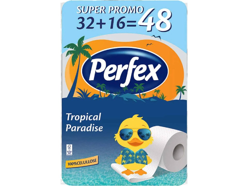 Perfex Tropical Paradise 48 db. Háromrétegű toalettpapír egzotikus illattal, extra puha és erős. Nagyszerű ár-érték arányú XXL kiszerelés az egész család számára.