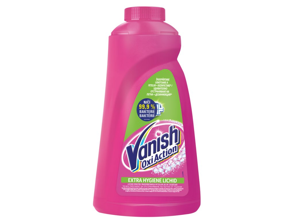 Vanish Oxi Action Extra higiénikus folteltávolító Folyékony előmosás folttisztító mélyen behatol a szálakba, és hatékonyan távolítja el a makacs szennyeződéseket is. Alkalmas mindennapi szövetekhez, színes és fehér vászonhoz. Kíméletes a ruhákhoz és kíméletlen a foltokhoz.